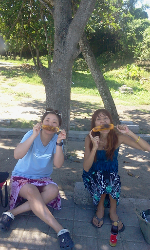 屋台で買った焼きとうもろこしを食べながら、おしゃべりタイム。