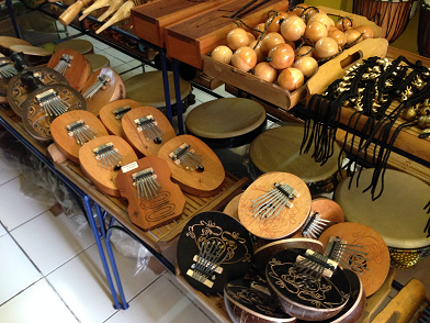 ココナッツや木製のカリンバ。