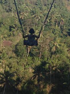 ジャングルのなかで巨大椰子の木のブランコ。