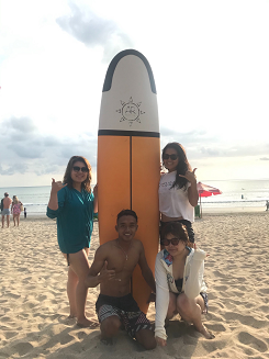 バリ島で楽しいサーフィン体験最後はみんなで笑顔でサーフィン!楽しかったーー!!ご家族で、カップルで、友人同士で、みんなが楽しくサーフィンできるバリライフのサーフィンスクールでサーフィンデビュー!バリ島の海でサーフィン体験。ご利用ありがとうございました。