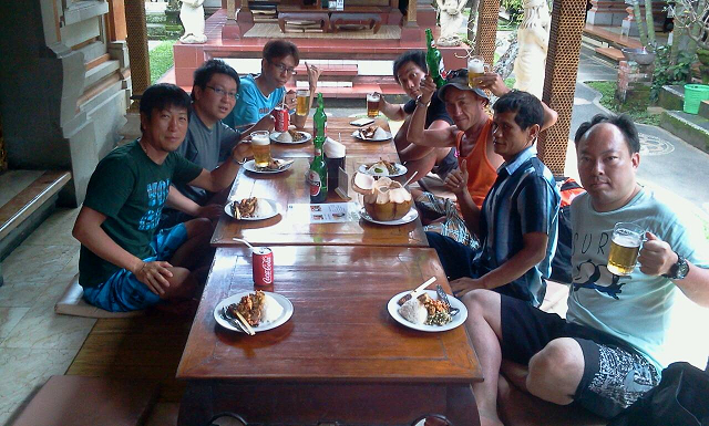 クタ地区ホテルから車で向かう途中でランチ。ビンタンビールを飲みながら